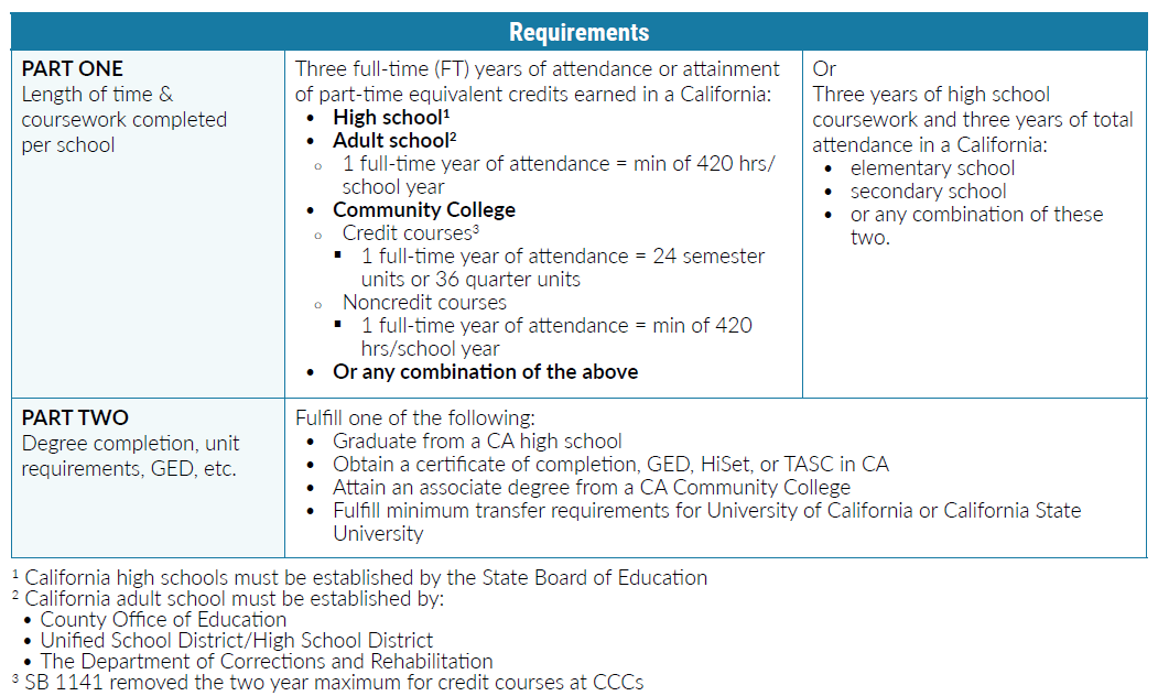 To be considered for the nonresident tuition exemption under AB 540/SB 68, students must meet 2 requirements: